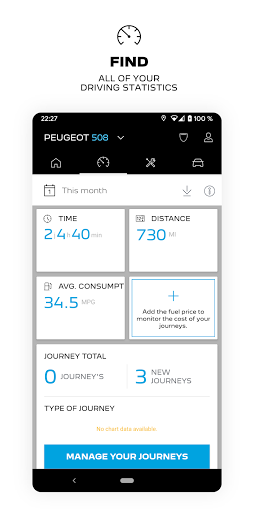 All PEUGEOT models are compatible with the MyPEUGEOT application. However, if your PEUGEOT is not equipped with Bluetooth, the ‘Driving’ tab (which provides details of your journeys, fuel consumption and mileage) is not displayed. You can still enjoy all of the other features of the app.
