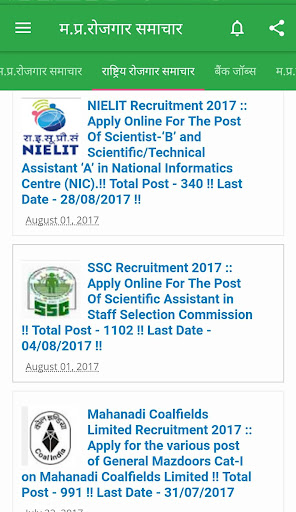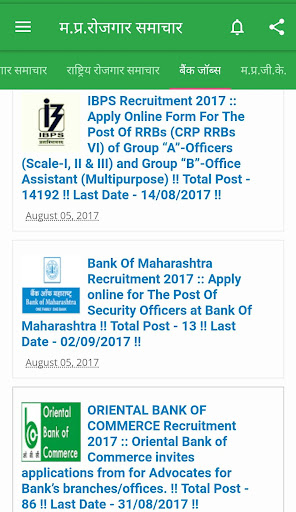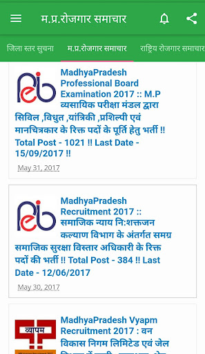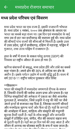 This app provides all informations regarding govt jobs (Sarkari Naukari) in all major sectors of MadhyaPradesh with an user friendly interface. This app also provides information regarding other government jobs, news. Example: Central Jobs, Bank Jobs, Railway Jobs, Police Jobs, Civil Jobs, Defence Jobs & jobs in other private sector. This app helps one individual to learn & prepare their mind for competitive exams & also to achieve their goals. Madhya Pradesh Rojgar Samachar apps provides news in both languages (Hindi & English) for their readers.
