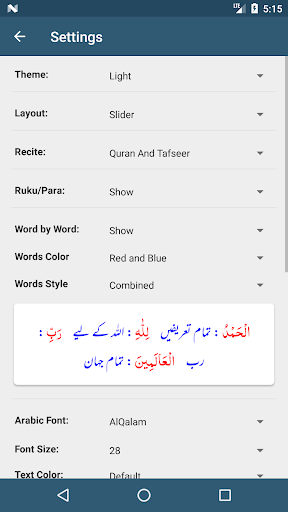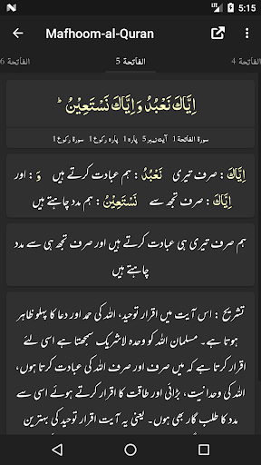 - Ability to show/hide Word by Word, Quran Translation (Tarjuma) and Tafseer