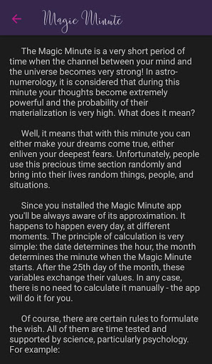 Since you installed the Magic Minute app you'll be always aware of its approximation. It happens to happen every day, at different moments. The principle of calculation is very simple: the date determines the hour, the month determines the minute when the Magic Minute starts. After the 25th day of the month, these variables exchange their values. In any case, there is no need to calculate it manually - the app will do it for you.