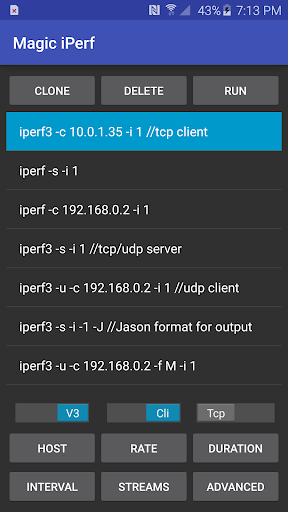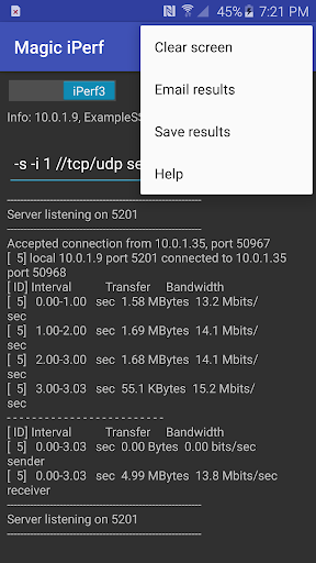 I wrote the initial version of this App to save my time in a project. In the project, I had to running both iPerf and iPerf3 with different options repeatedly. After the project, I figure this App may benefit other folks who are in the same situation, so I have polished the App a little and made it public here. So far I could only test the App on my own nexus phones. In case you see any problem on your device, you are welcome to send me a bug report with the models of your device and Android. In addition, I would like to acknowledge the great work by the iPerf and iPerf3 communities for such wonderful measurement tools.