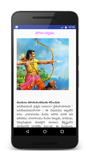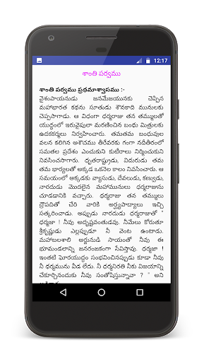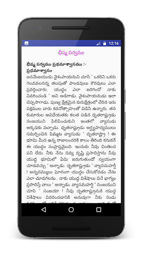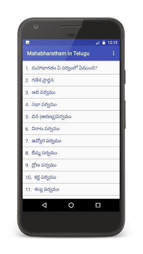 This app contains eighteen Parvas or sections viz., Adi Parva, Sabha Parva, Vana Parva, Virata Parva, Udyoga Parva, Bhishma Parva, Drona Parva, Karna Parva, Shalya Parva, Sauptika Parva, Stree Parva, Shanti Parva, Anushasana Parva, Asvamedha Parva, Ashramavasika Parva, Mausala Parva, Mahaprasthanika Parva and Swargarohanika Parva and Hrivamsa Parvam.