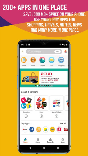Save 1000 MB space on your phone use your daily apps for shopping, hotels, news, travels, and many more in one place. It is an all in one online shopping app for all your daily needs and gives you instant access to all the top online shopping apps like Flipkart, Amazon, Snapdeal, Shopclues, etc. You can also play games, do Easy Mobile Recharge, Postpaid mobile bill payment, Free mobile recharge, price comparisons, book cabs, movie tickets, flight, bus and train tickets, get the latest deals, offers, and coupons, read the news, browse games apps and much more. Maino App has its own dedicated Web Browser - Swipe Browser! It is recognized as the best all in one app for shopping and productivity with over 800k monthly active users and over 5 MILLION Installs on the play store! Having over 200 instant apps on Maino App, it helps you to save your time as well as your phone's space.