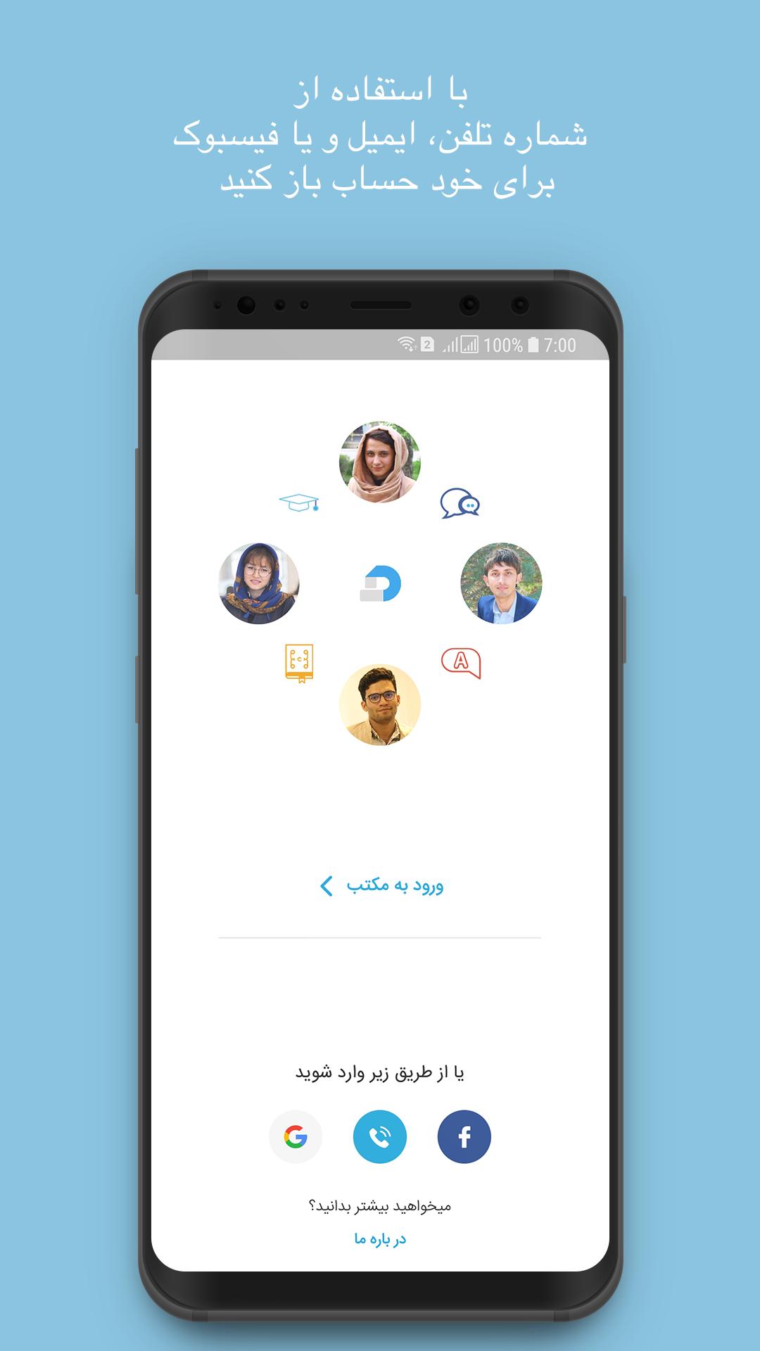 ۶. قابلیت ایجاد حساب و اکانت مکتب با استفاده از شماره تلفن٬ ایمیل و فیسبوک.