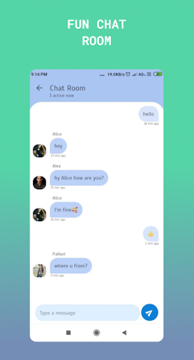 Our chat room has lots of fun while chatting.You can create your own chat room for a specific topic and the members can talk about particular topic,anyone can join the discussion and knowledge based group chat.