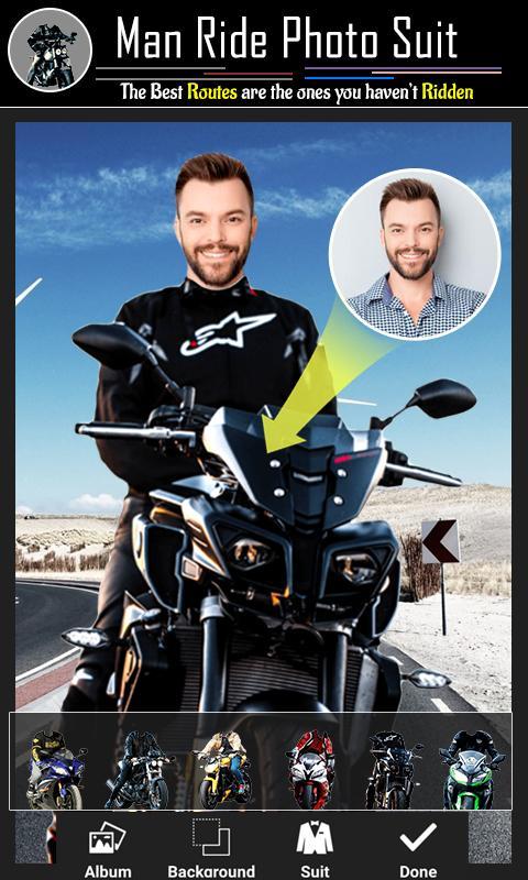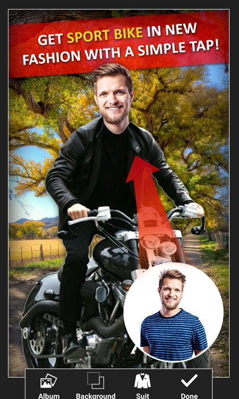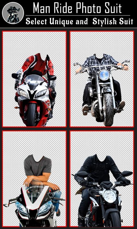 # Are you interested in Bike Rider suits and fashionable man Action Bike rider but you don't want to buy all of them? You are at the right place! Get the brand new free photo editor and check out what's new in man Moto Bike style! Install Man Bike Rider Photo Suit and get an Action Bike that complements your individual style.