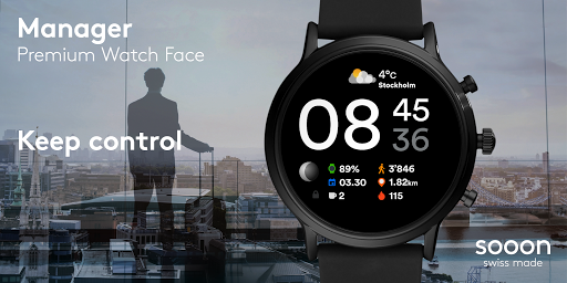 Manager Watch Face, a fully digital watch face designed to manage your time. It provides you with all the information you need at a glance.
