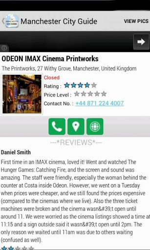 If you switch on GPS that would really help the cause of getting you updated results from Manchester, You will not only see the Listings, When you tap and open it, you can call to those places, See their Website and Read Reviews about the Places that are listed in this App.
