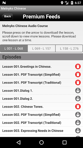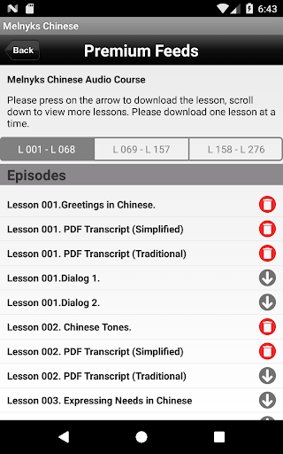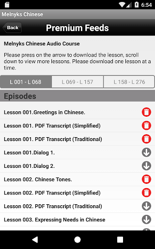 1) Each lesson has a PDF transcript in Simplified and Traditional Chinese characters, Pinyin and full English translations.