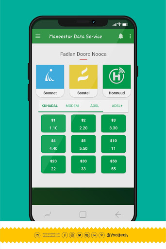 Вы можете купить пакеты SODNET от comtent.Вам не нужно никому разговаривать или платить за пакет Somnet и Somtel Hormuud.Если вы используете приложение для данных.Вы также получите услуги EVC PLUS, ANAF и Artimet
