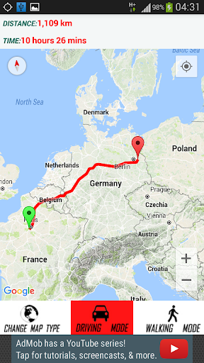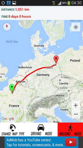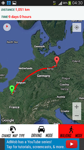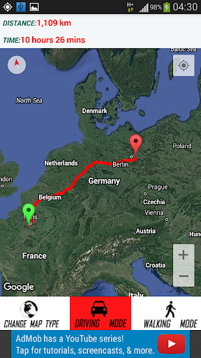 3. Click on Distance Calculator then First select any two locations & choose mode(Driving or Walking), the route will be displayed, distance & time will be displayed also, with possibility to change MAP types & back to current position