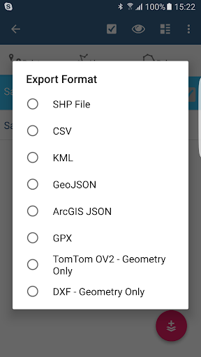 - Local SD card or remote export. At the moment shapefiles, KML, CSV, geojson, GPX and DXF export is supported,