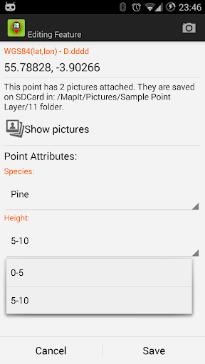 When saving location simply choose required attributes from predefined drop-down list, no need to type the same information over and over again. Import long list of attributes from text files and re-use them in number of projects. If necessary you can add pictures to each location as well.