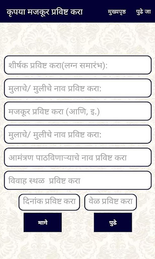 Sakharpuda Magazine, Satyanarayan Puja, Planet Access, Doğum Günü, Düğün Doğum Günü ve diğer büyük etkinlikler ve diğer küçük etkinlikler gibi Marathi Davet Broşürünü kullanarak evlilik davetiyesi ve diğer davet dergileri kendiniz oluşturabilirsiniz.Bir davet dergisi yaparken fotoğrafları çekebilir, istediğiniz emoji yapabilir ve yazdığınız metni renklendirebilirsiniz.Bu uygulama ücretsiz ve kullanışlıdır ve oluşturduğunuz davet mektubunu Facebook WhatsApp, e -posta vb.Ana sayfadaki herhangi bir konu seçin.