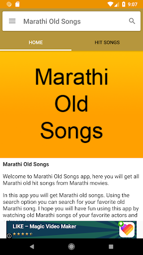 I hope you will enjoy old Marathi Songs on your smart phones or tablets without any difficulty. The main purpose of this app is to remind all Marathi old songs fans of olden days with beautiful songs from Marathi old movies, there is a saying that old is gold and I think old Marathi songs are golden Marathi songs and same is true for old Marathi movies. I wish and hope you will enjoy all the old Marathi songs in this app.
