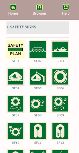 The browser section gives detailed information in 3 languages (EN, FR and GER) on 6 categories of signs: IMO Safety Signs, IMO Rescue Boat Launch Signs, IMO Direction and Exit Signs, IMO Fire Control Signs, ISO Personal Safety Signs and as a bonus the UN Global Harmonized System for Hazardous Goods.