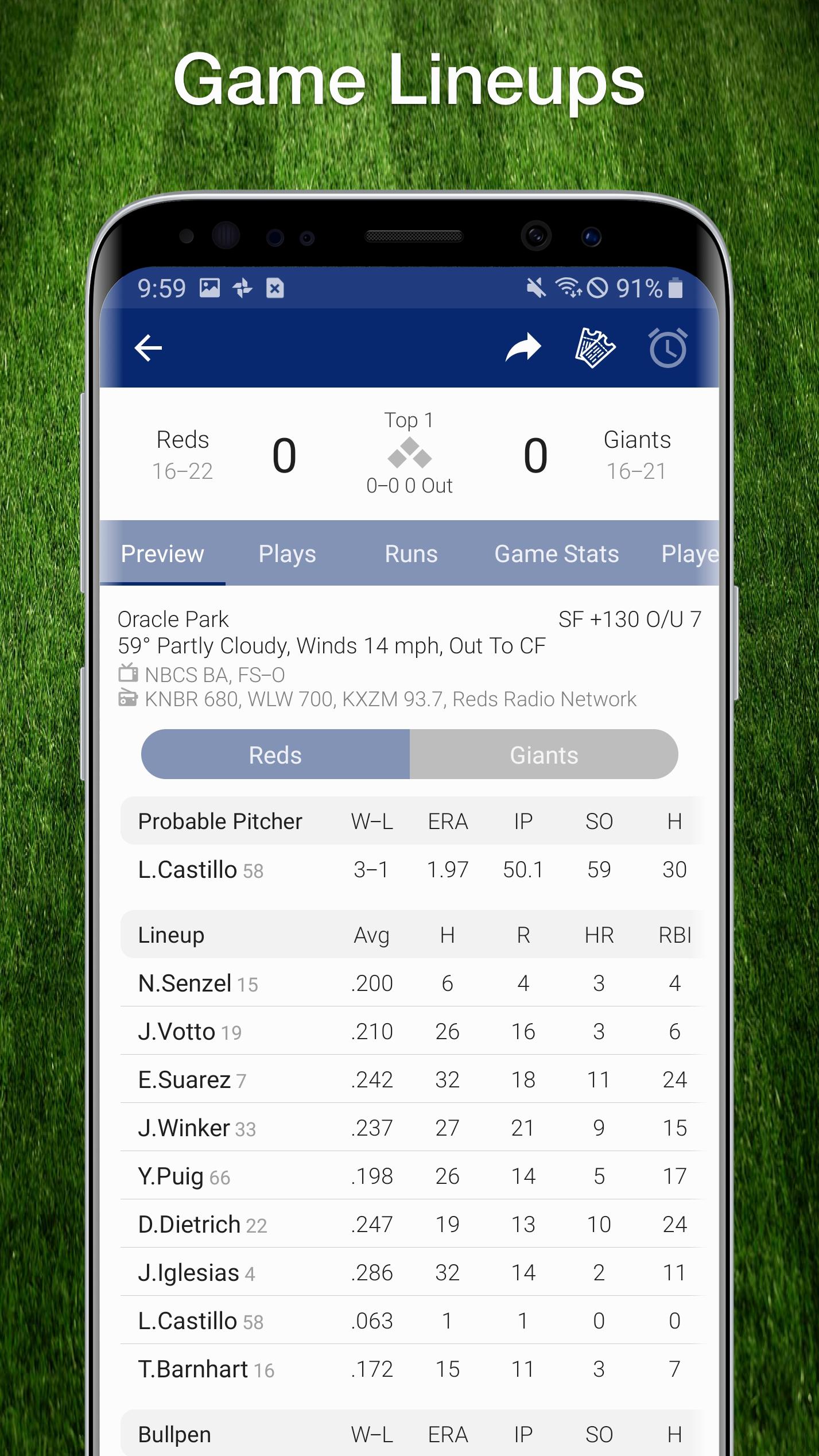 * Game preview includes probable pitchers, batting lineups, & teams matchup stats!