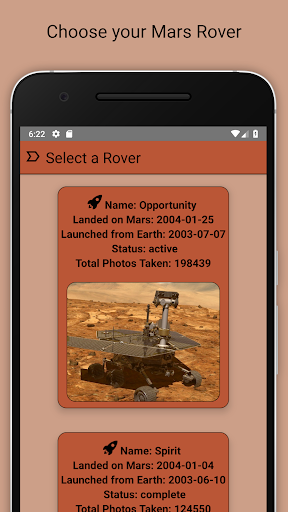 Explore Mars Rovers' photos! Pick a Mars Rover, select a date and voila: all the available photos from that Rover taken on Mars on that specific date, taken directly from the NASA database.