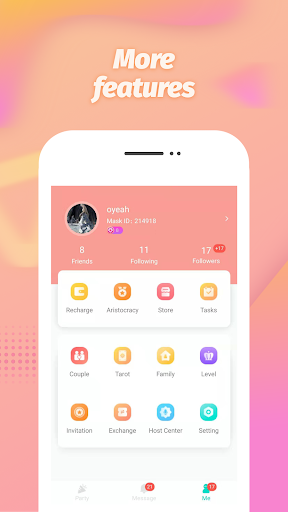 Mask is a new group voice chat & online entertainment App in the Arab world. In Mask, you will find live group voice chat rooms, online entertainment communities, popular live music houses, Karaoke singing room, playing a range of small games, making lots of friends and sending a range of amazing grand gifts.