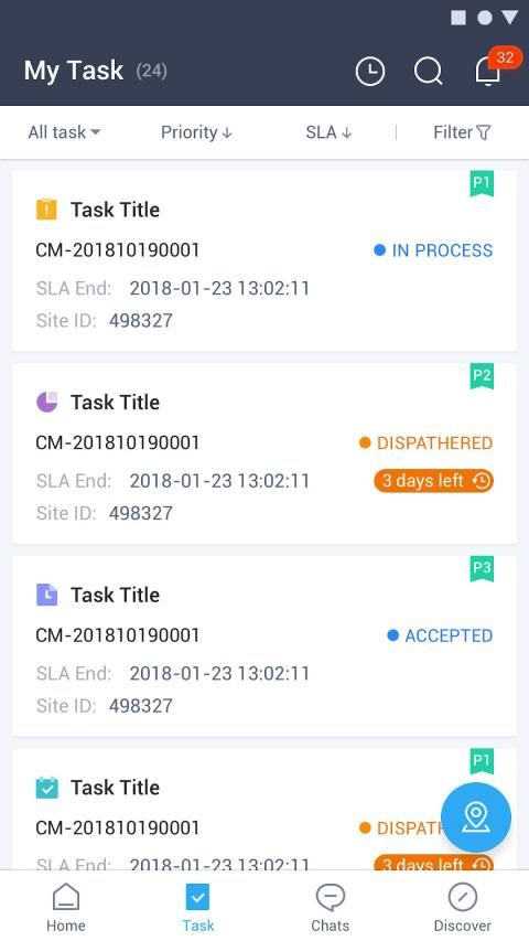The maintenance engineer processes the task in time according to the progress of the task, and communicates with the dispatcher online in real time, easily involve engineers into a group chat, and the terminal synchronizes the task status, processing time, and location to the server.