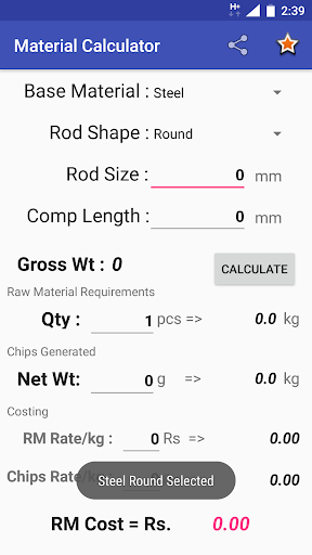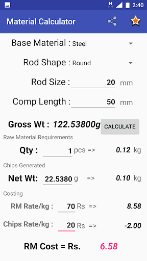 This app is useful for people in auto component manufacturing industries or who use raw material as rods of different shapes and base material.