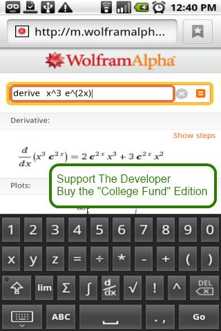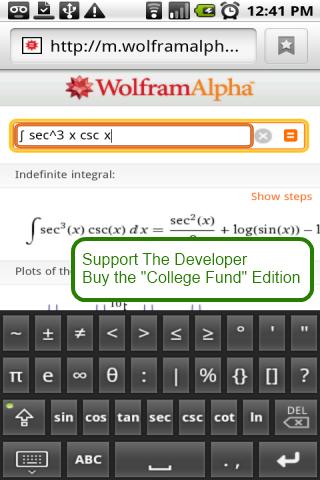 A replacement on-screen keyboard with many helpful math keys.install:settings > language & keybrd > (check math keyboard.then longpress any textbox, select 'input method' and then math keyboardworks great for wolfram alpha onlinea general tool for math trig calculus work*Wolfram Alpha is a trademark of Wolfram Alpha LLCcontent rating: Everyone