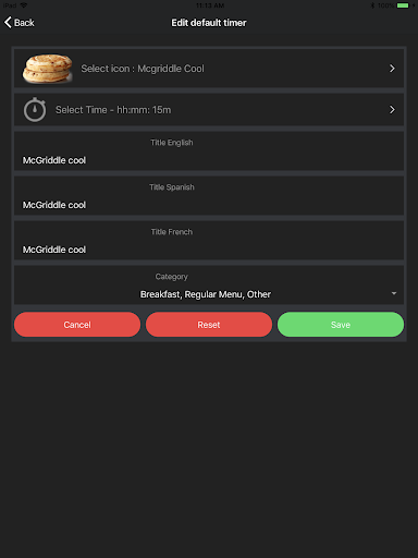 McDonalds Prep Timer designed to manage Prep Table Timers. User can easily manage condiments & expiry. User can customize condiments in categories like Breakfast, Lunch or Dinner. User can assign multiple categories to each condiment. App logs activities for audit. App has two modes - Operator & Store manager mode. In Store manager mode, user can manage configurations and In Operator mode, User has ability to reset & stop condiments. App supports multiple languages like English, Spanish, French & Chinese.