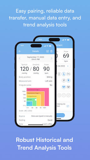 MedM Blood Pressure Diary app offers easy pairing, reliable data transfer to offline or in-cloud storage, can be used with or without registration, supports thresholds, data Sync with Google Fit and Health Connect, manual data entry from legacy meters, and provides trend analysis tools.