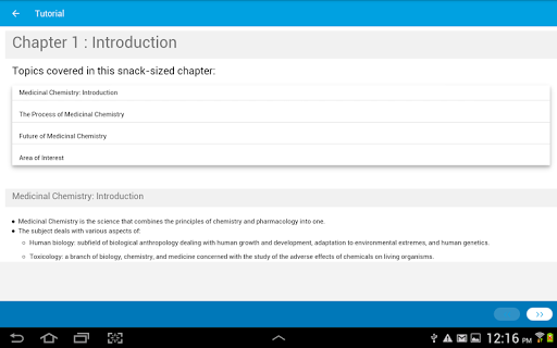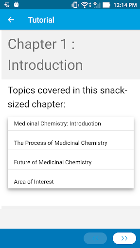 You have limited access to the content provided. For full access to the content, please login and purchase this application. This app provides a quick summary of essential concepts in Medicinal Chemistry by following snack sized chapters: