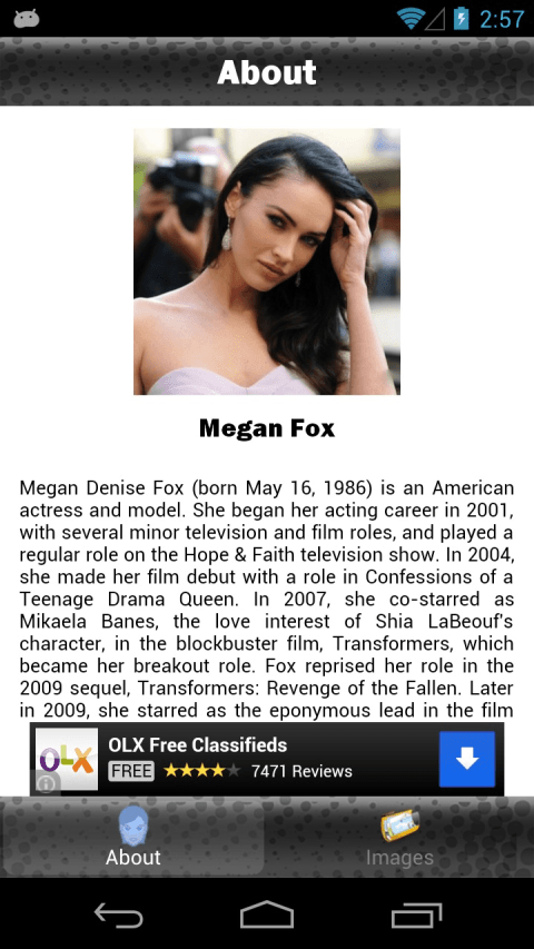 Get Megan Fox on your phone with this must have app: - 18 HOT wallpapers for your Android Tablet or Phone - Save or Set Wallpapaer or Share through Google+, Gmail, SMS, Whats App, Facebook, Skype, Twitter, Picassa and other installed social sharing services installed on your device. - Biography - Works on Android OS 2.1 to 4.2 - Cool Swivel Interface for Images Coming Soon: - Facebook, Twitter and Youtube Feeds