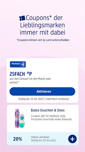 В области «купонов» вы найдете обзор текущих купонов DM.Вот не только ваши купоны Lucky Child*, но и ваши купоны на DM и окупаемость.Чтобы иметь возможность увидеть более подробную информацию, нажмите непосредственно на купон.Это проходит путь от активации купона к выкупам в филиале или при заказе онлайн как можно проще. индивидуальные купоны на ваш счет.Вы можете выкупить это в своем филиале или для онлайн -заказов.Вы можете найти условия выкупа и дополнительную информацию о соответствующем купоне.