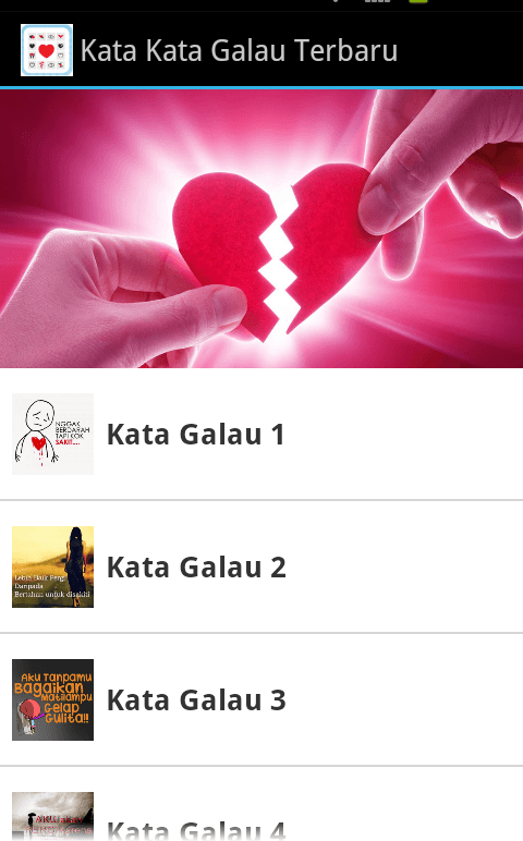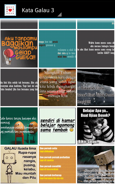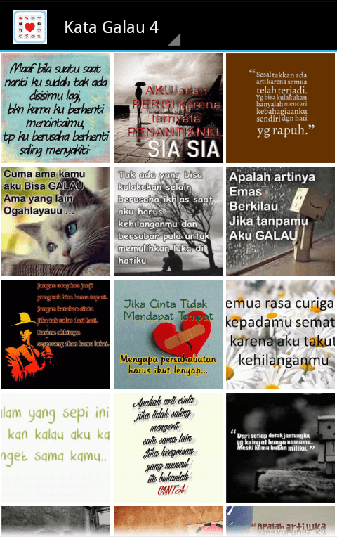 Kata Kata Galau Terbaru adalah aplikasi yang berisi kumpulan gambar kata-kata galau. Kalau kamu lagi galau atau bahkan mungkin patah hati aplikasi ini sangat cocok buat kamu. Kamu bisa kirim foto atau gambar kata-kata galau tersebut ke doi via whatsapp, bbm, line, wechat, dan lain-lain.