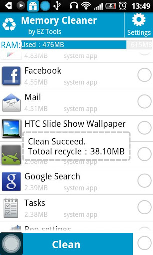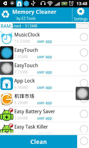 Recycle the memory speed up your phone.Android doesn39;t recycle the memoryRAM when you close the app, it will wastes those memory.So your phone will more and more slow.Memory Cleaner help you clean the app which you no more used, speed up you phone.: Batch clean Auto clean White list Root cleanwidget cleankwmemory, ram, booster, optimize, boost, optimization, task killer, task manager