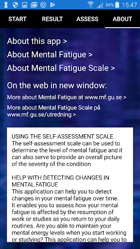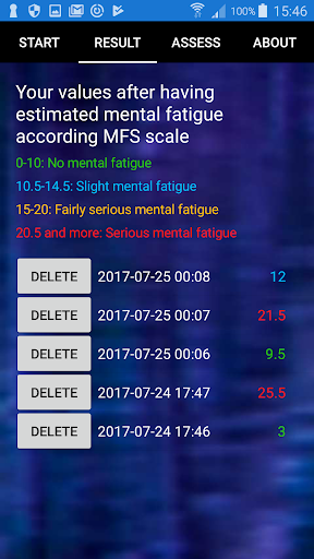 This application can help you to detect changes in your mental fatigue over time. Once you have answered the questions, the scores will be added up and the results will be presented in a list.