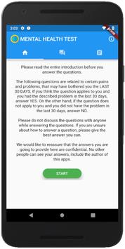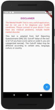 The Mental Health Test is app that help you to know your mental health status. This test is adapted from Self Reporting Questionnaire (SRQ-20). The cut-off value of the test is 6/7 (if your have score same or below 6, you are categorized normal). The cut-off value may be different according to certain area, language, culture, or country.
