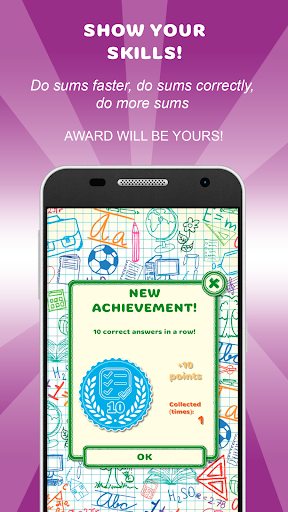 Application automatically raises and lowers tasks complexity level. This allows your kid to do sums of appropriate level and to improve his current math skills.