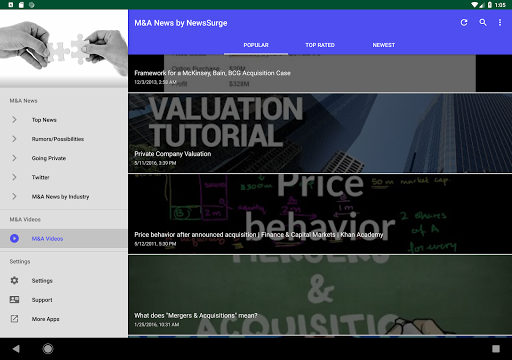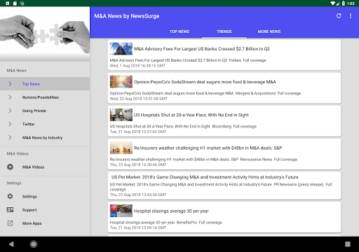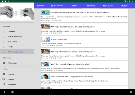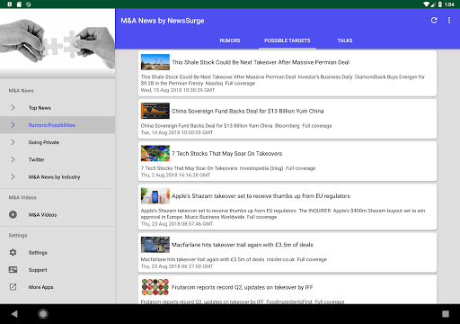 Latest Mergers & Acquisitions News Today at your fingertips, with notifications support (You can change notification preferences in the Settings section of your Android Device)! Get the latest Buyout & Merger News plus rumors on potential ones. There are also individual sections dedicated to M&A activity in specific industries such as Tech, Financial, Healthcare, Utilities & more.