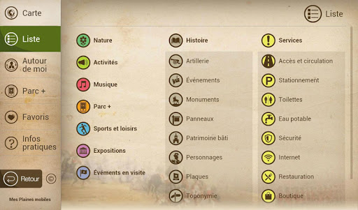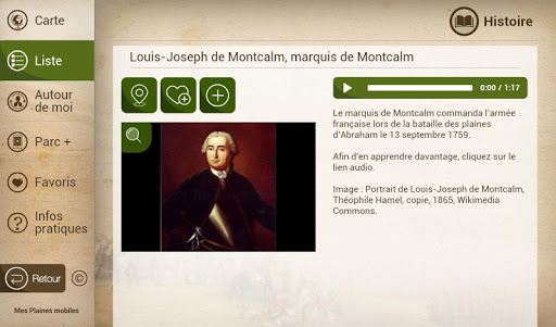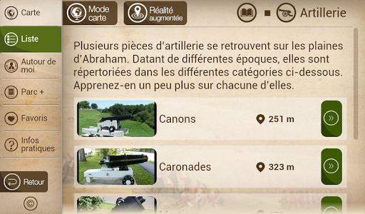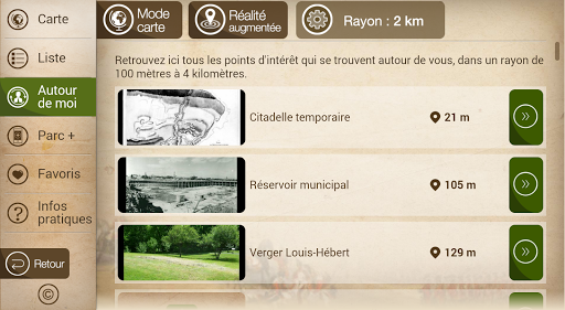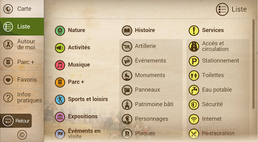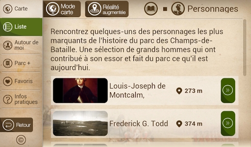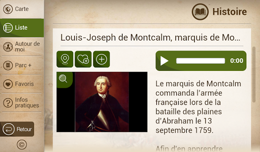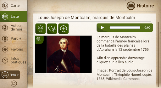 Avec près de 200 points d’intérêt, plongez au cœur du parc et de son histoire : les batailles de 1759 et 1760, les tours Martello, les attraits naturels du site (jardin Jeanne-d’Arc), les activités et expositions (musée, spectacles musicaux), les sports et loisirs. En plus de vous orienter sur l’ensemble du parc des Champs-de-Bataille vers un des nombreux services (stationnements, toilettes), vous profiterez ainsi au maximum de votre visite sur les plaines d’Abraham et au parc des Braves.