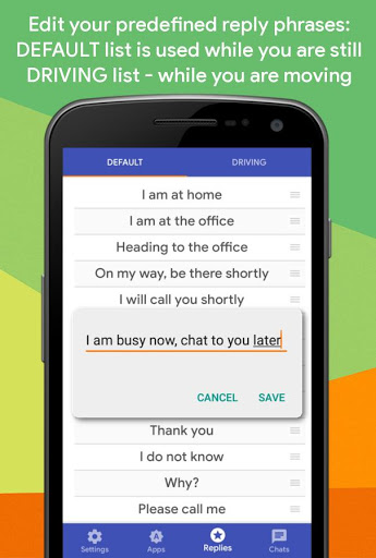 You can compose and reorder your replies in the phrase editor. Rocket Reply automatically detects when you are driving a car and brings a list of predefined phrases allowing you to select a response with a single tap. Do not worry if your car is not equipped with Android Auto. Rocket Reply can speak to you through a standard audio system.