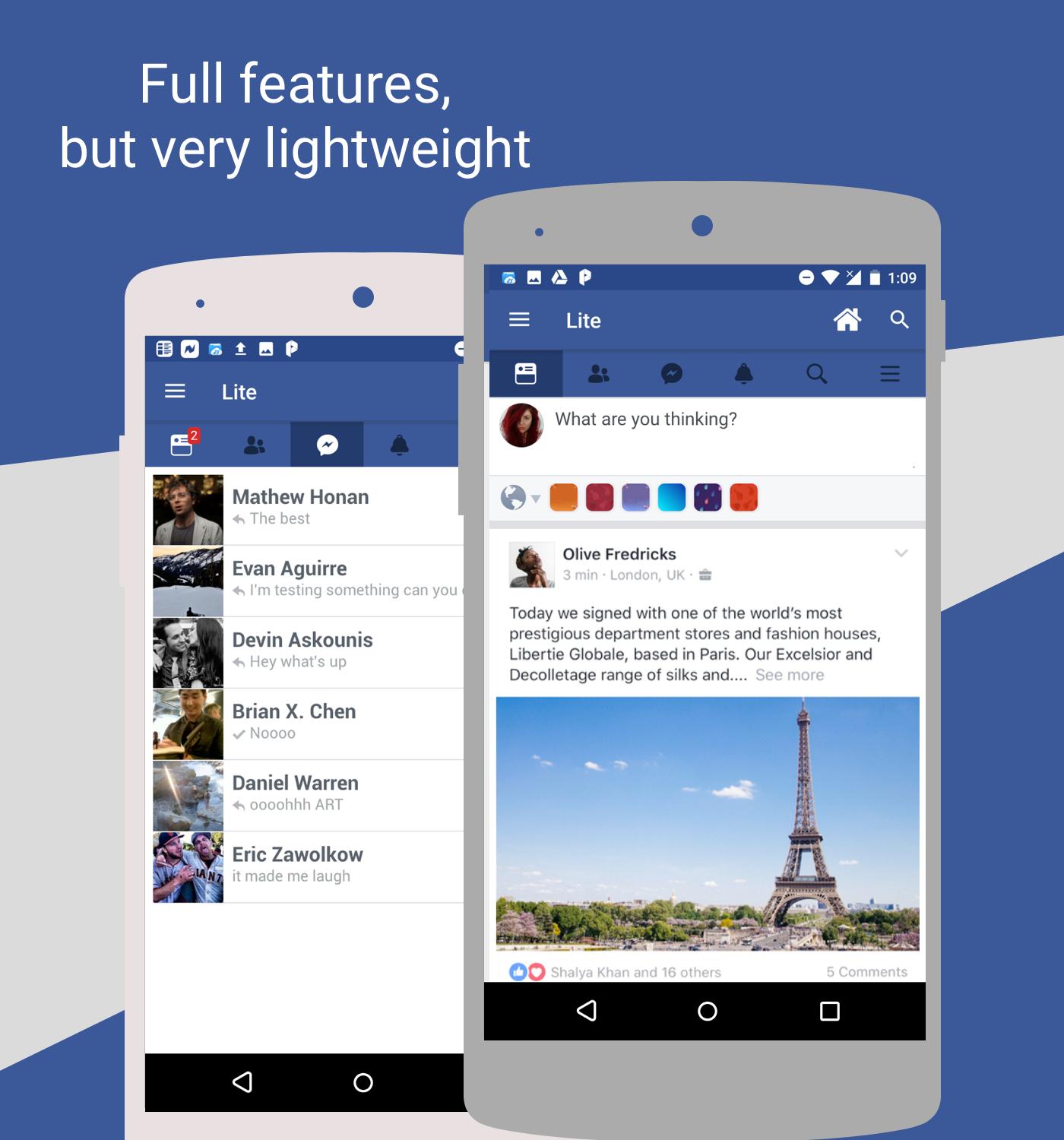 Lite - Messenger, Free , Fast Messenger is an alternative application help you using FB easier and funnier, saving data and using something extras that the original app don’t have, such as update new trending videos, find new friends nearby and find friends over the world, download video...