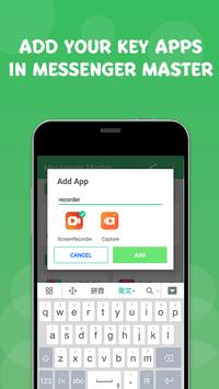 Messenger Master, a free app, can help you send messages to all your families and friends without installation limits. Quickly open all your Messenger via Facebook, Twitter, Whatsapp, Instagram, Hangouts, Snapchat, Viber ,Pinterest and other 40 messenger apps. Take voice call & messages quickly from any screen. The Messenger app will help all users open their popular Messenger applications, Messages, Video Call applications, Text and SMS clients, Chat applications, Email applications and other popular texting messenger apps from any screen.
