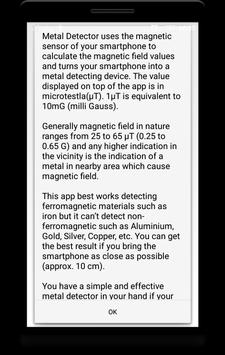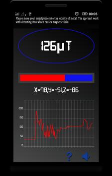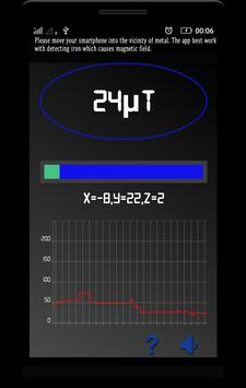 Metal Detector uses the magnetic sensor of your smartphone to calculate the magnetic field values and turns your smartphone into a metal detecting device. The value displayed on top of the app is in microtesla(µT). 1µT is equivalent to 10mG (milli Gauss). Generally magnetic field in nature ranges from 25 to 65 µT (0.25 to 0.65 G) and any higher indication in the vicinity is the indication of a metal in nearby area which cause magnetic field.