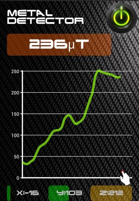 When a ferrimagnetic metal object obscures the natural magnetic field and the result is shown realtime on the graph. Different shapes and sizes of metal contain ferrimagnetic elements will all register in a different ways; long thin items like screwdrivers seem to have to greatest effect so have fun experimenting!