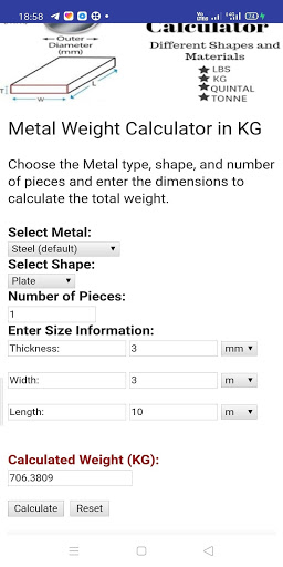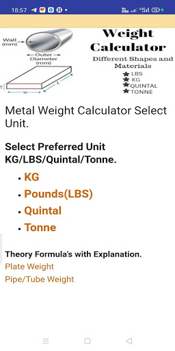 Best free Metal weight calculator for android, for getting theoretical weight of Metals like steel plate, bar, aluminum plate bar pipes you will get weight of any metal of any shape free.