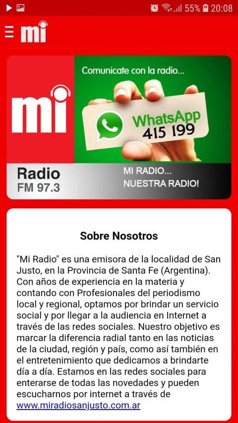 "Mi Radio" es una emisora de la localidad de San Justo, en la Provincia de Santa Fe (Argentina). Con años de experiencia en la materia y contando con Profesionales del periodismo local y regional, optamos por brindar un servicio social y por llegar a la audiencia en Internet a través de las redes sociales. Nuestro objetivo es marcar la diferencia radial tanto en las noticias de la ciudad, región y país, como así también en el entretenimiento que dedicamos a brindarte día a día. Estamos en las redes sociales para enterarse de todas las novedades y pueden escucharnos por internet a través de www.miradiosanjusto.com.ar