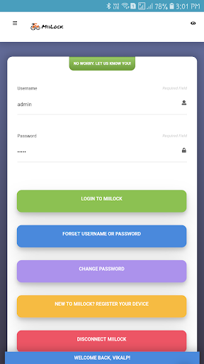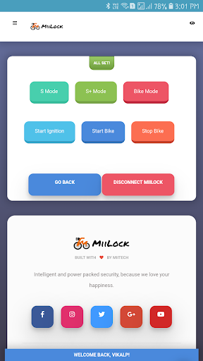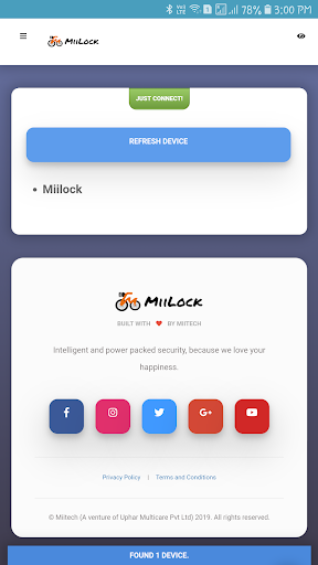 "Miilock - Intelligent protection for your bike" comes up with a device installed in your bike and prevents theft or snatching of the bike using Bluetooth Smart technology. This apps connects with your bike device. Subsequently, users had to login the device with their corresponding User Id and Password.