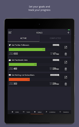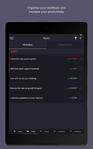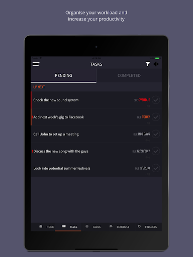 The tasks tab will enable you to manage your pending tasks to help you to manage your time and workload and get more productive. Get a sense of achievement and stay motivated by crossing out completed tasks and seeing the list of completed tasks stack up!