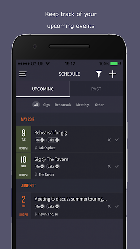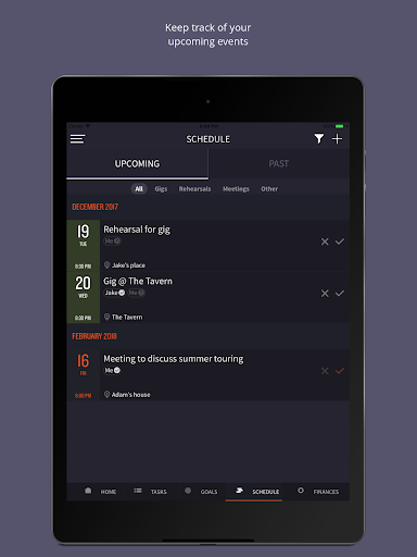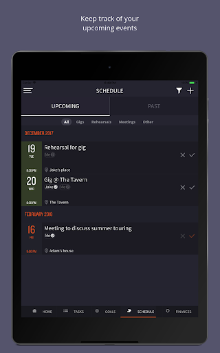 The schedule tab will enable you to track your events, from gigs to rehearsals and meetings. The calendar view will help you to easily see what's coming up. For each event, keep track of the date, time, location, address, and use the integrated map functionality to find the location at the scheduled time. If you are in a band, you can view the attendance of your band members for certain events to determine who can and can't attend. Whether you're entering one-off gigs and practices or organising a tour, Mike will make managing your various events a breeze!