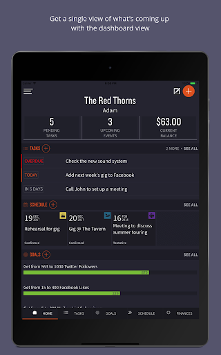 The app requires a subscription for the majority of features - managing tasks, events, goals, and finances. Sign up for a subscription within the app. You can choose between an Individual or Band account.