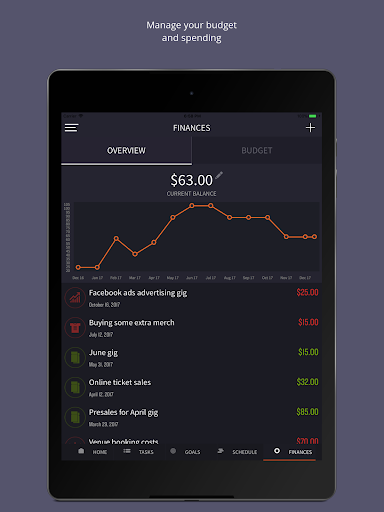 The home screen gives you a single-view of the pending tasks you have, upcoming events, goals you have set, and your current balance to give you an overview of how you are managing your finances.